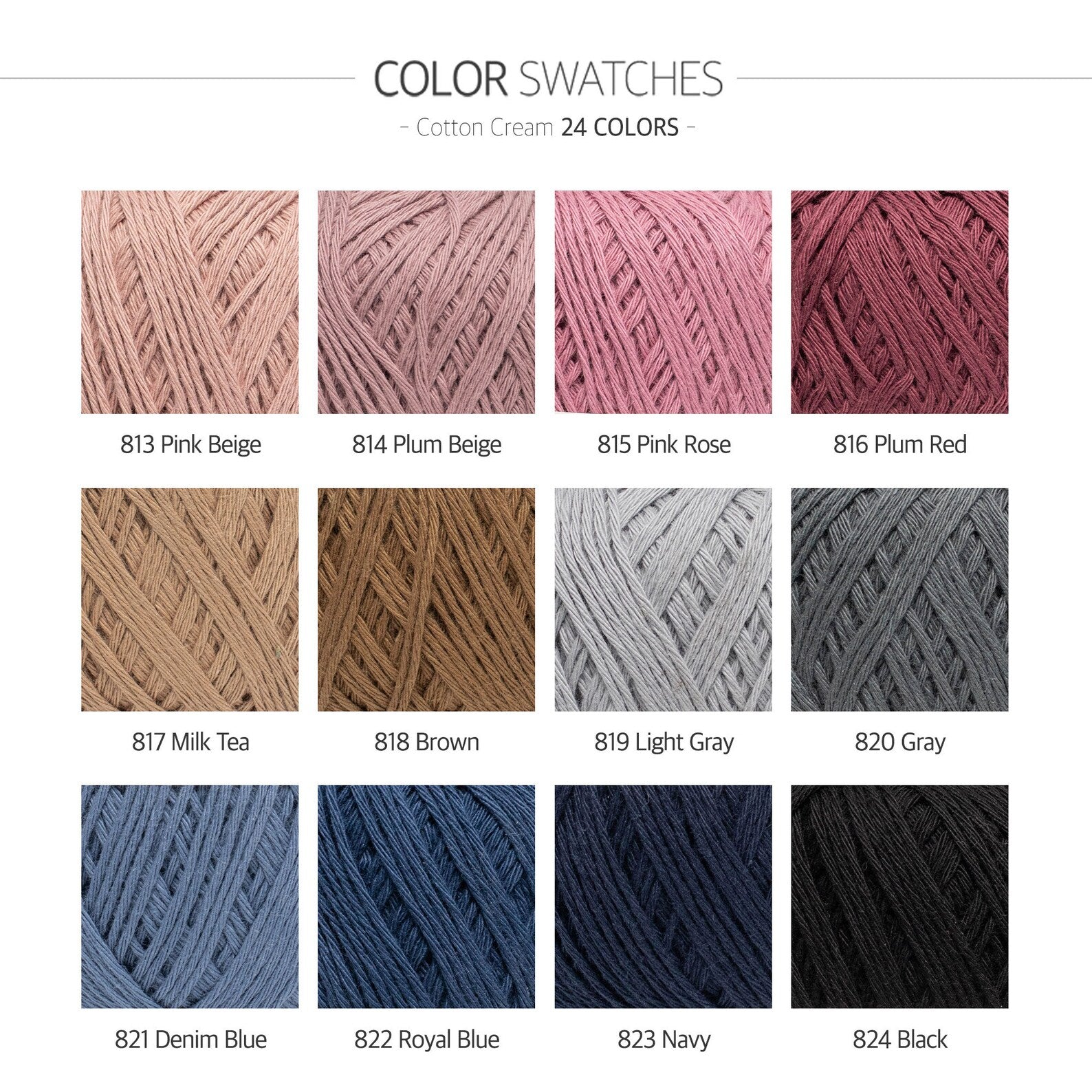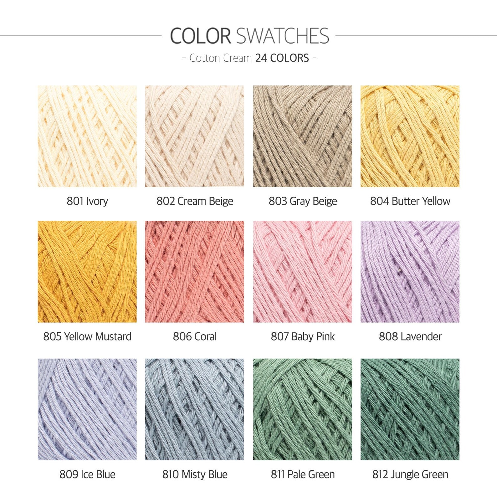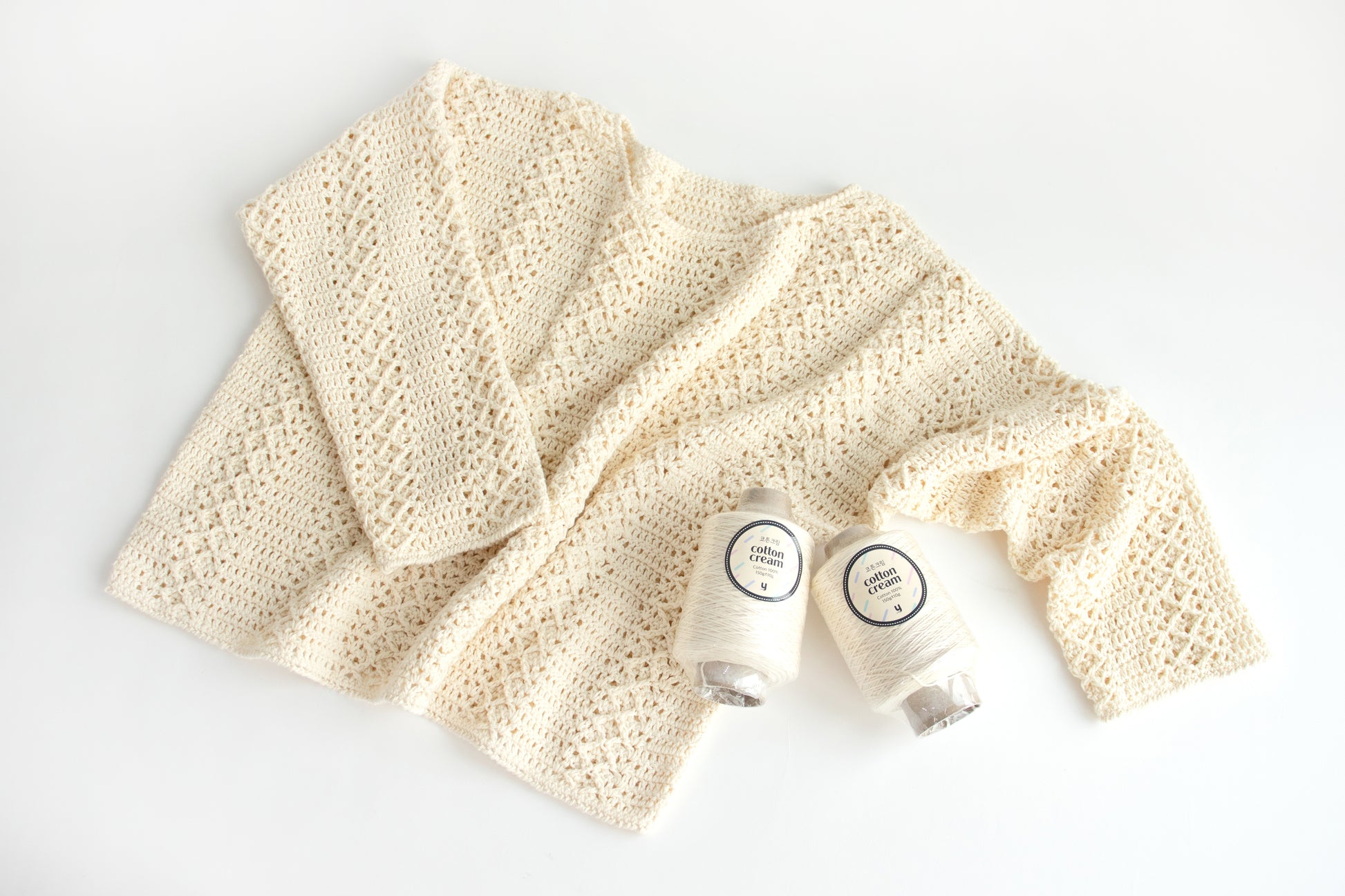 Cotton Cream is 100% cotton yarn which is soft and silky. It's bouncy and not stretchy. So it's good to make sweaters, shawls, and curtains. Projects made out of Cotton Cream tend to be flowy. The thread can be used in both crochet and knitting. The creamy and soft color matches well with the texture of the yarn!