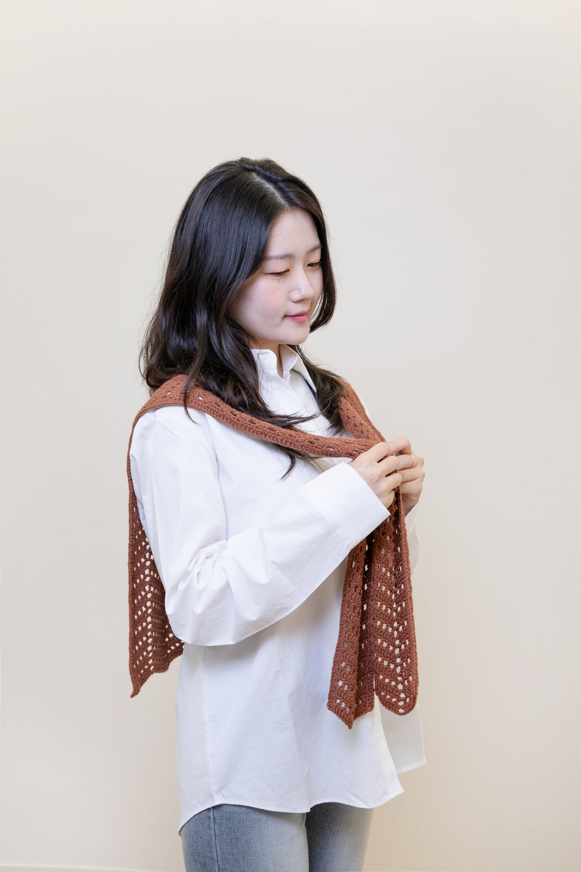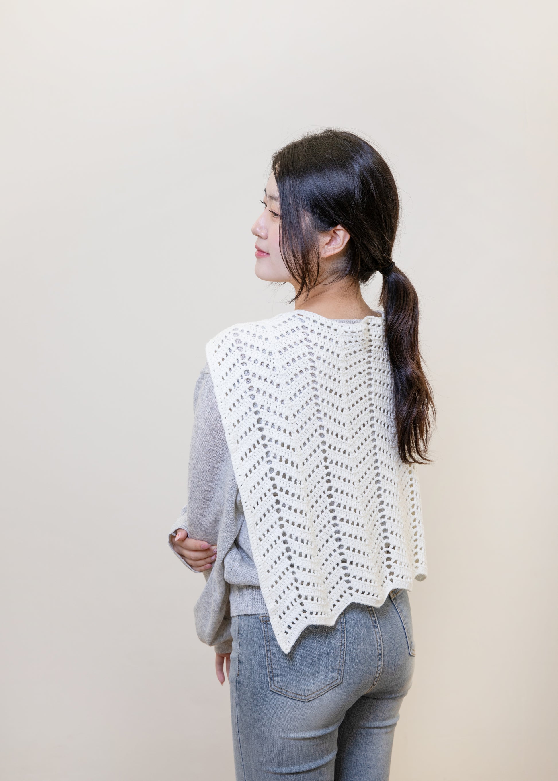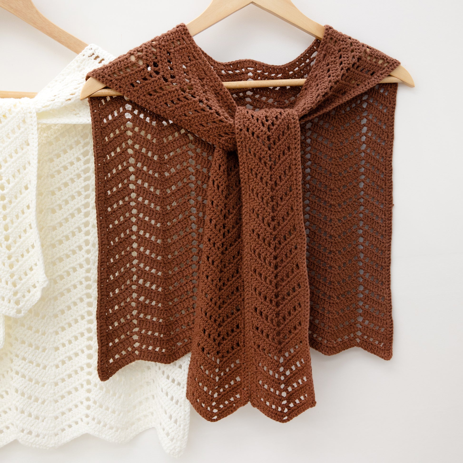 シェブロンステッチをベースにした、フェイクショール風デザインの秋用のショールです。